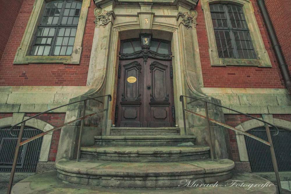 Die Vorderseite und Haupteingang der Sankt Michaelis Kirche. Außer dem Haupteingang vorne gibt es noch weitere Nebeneingänge. Im Süden in Richtung Hafen und im Norden in Richtung Großneumarkt.